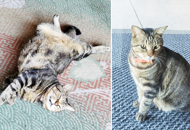 花かざしの看板猫「おやかた」㊨とくつろぐ「おやかた」(提供)