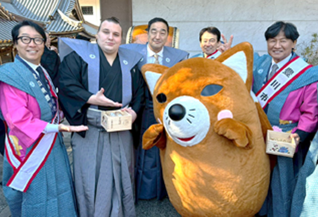 東京都港区赤坂の豊川稲荷東京別院で3日、毎年恒例の節分祭が開かれ、今年も豊川市から竹本幸夫市長や市観光協会の笠原盛泰会長、平松賢介副会長らが豆まきに参加した。著名人らも駆けつけ、先月の大相撲初場所で20年ぶりの新大関優勝を飾った安青錦や、同市出身の俳優で市の広報大使を務める渡辺いっけいさんらと交流した。