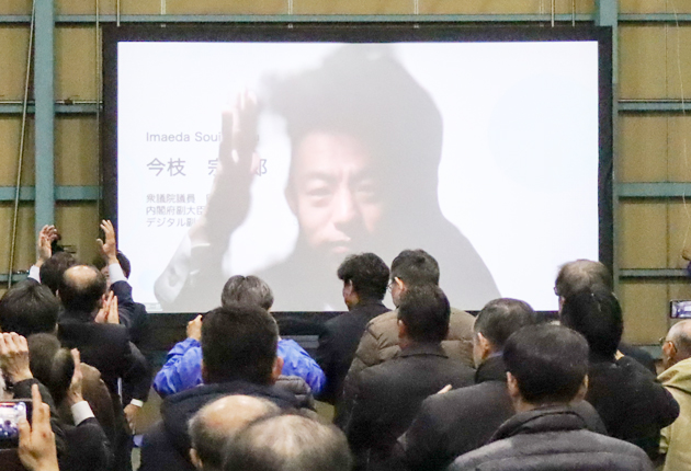 リモートで画面越しに万歳する今枝氏(8日夜、豊川市新豊町の選挙事務所で)