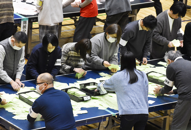 8日夜、開票作業にあたる豊川市の職員ら(市総合体育館で)