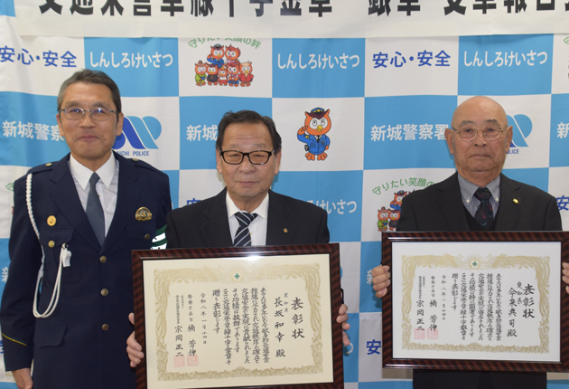 交通栄誉章に受章した新城市杉山の長坂和幸さん(77)と市内徳定の今泉典司さん(83)の2人の報告会が10日、 新城署であった。 長坂さんは、先月14日東京で開かれた「第66回交通安全国民運動中央大会」で「交通栄誉章緑十字金章(交通安全功労...