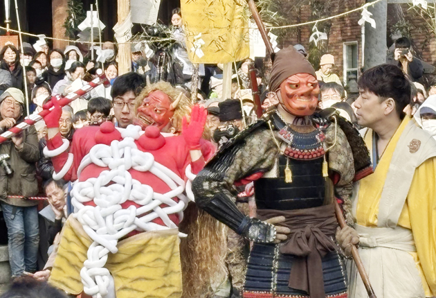 攻防を繰り広げた赤鬼と天狗(安久美神戸神明社で)