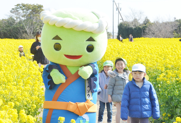 菜の花畑では、NPO法人田原菜の花エコネットワークの会員やご当地キャラクターの「キャベゾウ」が歓迎。一面鮮やかな黄色に染まった畑の散策路を元気よく歩き回り、園児たちは「きれい」と一足早い春を満喫した。菜の花の花束がプレゼントされると、園児の「ありがとう」、会員の「また来てね」という声が飛び交っていた。
