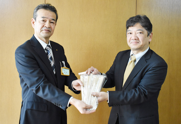 大江教育長に割り箸を寄贈する石原会長㊨(豊川市音羽庁舎で)