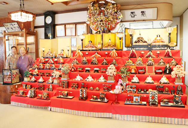 雛人形飾りと共にお客さんを迎える女将ら(呑龍で)