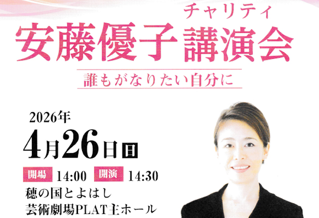 国際ソロプチミスト豊橋(西田美由紀会長)が4月26日、ジャーナリスト安藤優子さんのチャリティー講演会を開催する。現在、チケットを販売している。 「誰もがなりたい自分に」と題し、長年ジャーナリストとして活躍してきた安藤さんが自らの経験を踏ま...