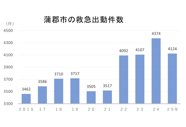 蒲郡市消防本部は、昨年1年間の火災と救急活動の実態をまとめた消防統計を公表した。それによると、市内の救急車の出動件数は、過去最多を更新した前年より250件少ない4124件で、搬送者数は同比259人減の3591人だった。