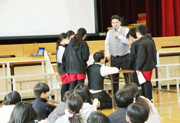 お笑い芸人ガーベラガーデンとカードバトルを展開(豊橋市立豊小学校で)