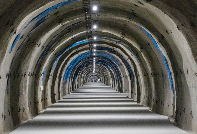 SF映画のワンシーンのような避難坑内部(望遠レンズで撮影)=三遠池場坂トンネル