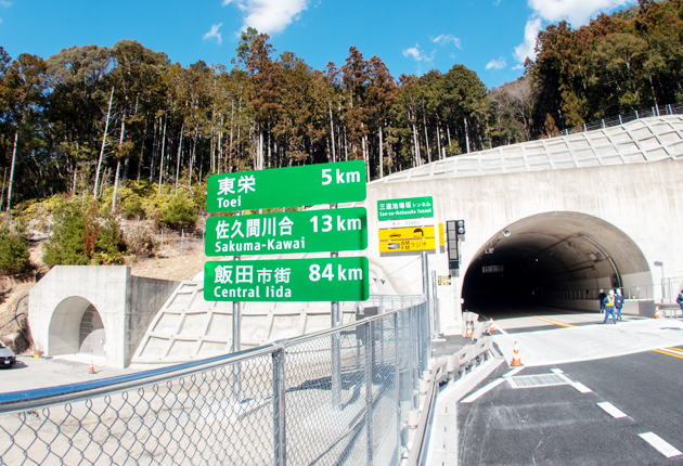 道のりは概ね、なだらかな上り坂だ。こう配もカーブもきつい既存の国道151号に比べ、運転は格段に楽になるだろう。トンネルを抜けてもまたトンネルという行程だったが、最後の三遠三輪トンネルを出ると、東栄ICの上に青空が広がっていた。