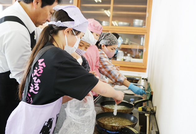 自分で下処理したメヒカリを油で揚げる児童たち(豊橋市下地小学校で)