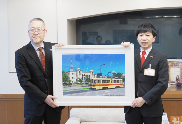 作品を受け取った長坂市長㊨と実行委員会の岡本副委員長(豊橋市役所で)