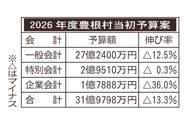 一般会計のマイナス編成は3年ぶり。記者会見した伊藤浩亘村長は「平年ベースの規模に戻った。27年度以降に新たな大型事業が控えており、いったん立ち止まってじっくり考える」と話した。