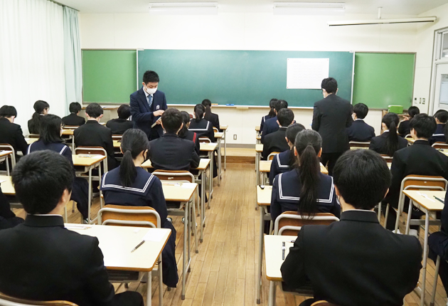 問題用紙の配布を待つ受験生(時習館高校で)