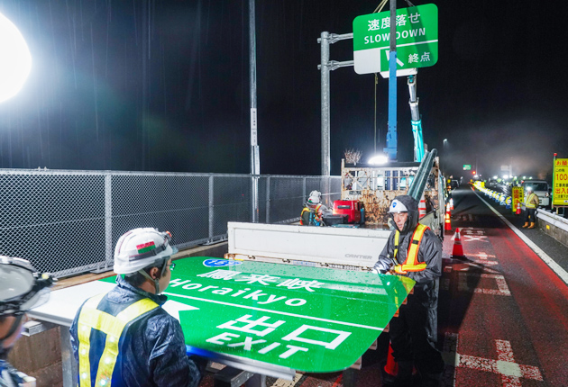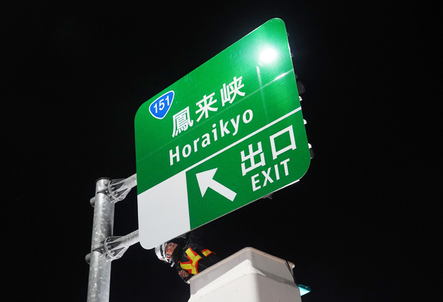 来月14日に新城市と東栄町の間の開通が迫る三遠南信自動車道で、既存区間を夜間通行止めにし、道路をつなぐための工事が始まった。同市名号の鳳来峡インターチェンジ(IC)では24日夜、「終点」を示す案内標識を外して「出口」の標識に交換する作業があった。