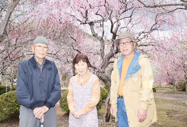 見ごろのしだれ梅と木下さん夫妻、宏之さん㊨(新城市副川の木下梅園で)