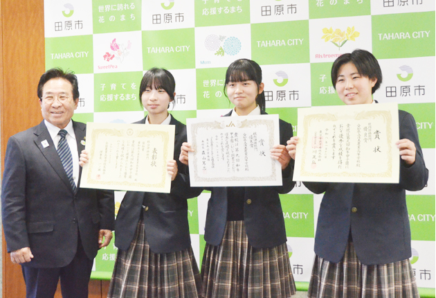 生徒は農業科4人が関わり、市役所を訪れた3年彦坂香穂さんは「愛情を込めて育てたので自信を持って出品、いい結果で良かったです」と感想。実家で生まれた牛を出荷した3年の峯田凜さんは「生まれた時から見ていたので、出荷は寂しかったですが、賞をとれたのでうれしいです」と話した。