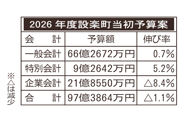 設楽町は26日、2026年度当初予算案を発表した。一般会計は前年度当初比0・7%増の66億2672万円とし、防災体制強化や関係人口創出に取り組む。町債償還などの経費が膨らむが、将来の大型施設整備に向けた基金の積み立ても始める。