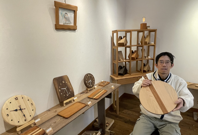 時計やまな板など新生活に適した作品を紹介する綿引さん(栄知村で)