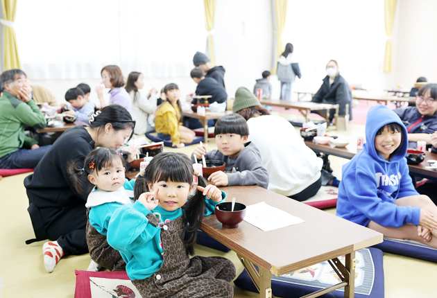 会場には家族連れの姿も多く、妹家族に誘われて訪れた中西真莉菜さんは3人の子どもと参加。4歳の紬ちゃんはうどんを頬張りながら「おいしい」と笑顔を見せた。