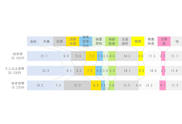 消費支出の内訳をみると、「食料(外食除く)」が21・7%と最も高く、次いで「交通・通信」の14・5%だった。19年比では食料のほか、「教養娯楽」や「外食」の割合が上昇。一方、交際費や被服、教育費などは低下した。全国平均(25万1242円)との比較では、教養娯楽や外食への支出が全国を上回る結果となった。
