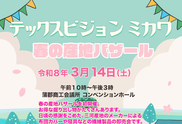秋恒例の繊維総合展「テックスビジョン ミカワ」内で好評の即売会「産地バザール」が14日午前10時から、蒲郡市港町の蒲郡商工会議所コンベンションホールで初めて単独で開かれる。 産地バザールは繊維製品の掘り出し物が買えるとあって、テックスビジ...