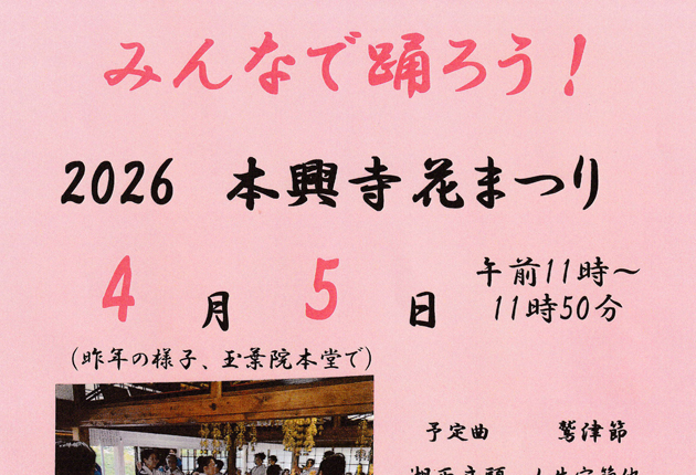 湖西市文化協会は4月5日、市内鷲津の本興寺境内で恒例の「本興寺花まつり」を開く。湖西民謡保存会が踊りを繰り広げる。 メンバーが中心になって北原白秋作詞で鷲津に伝わる「鷲津節」をはじめ、トヨタ自動車の元祖・豊田佐吉を歌った「佐吉のふるさと音...