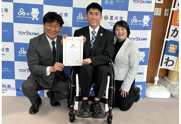 昨年11月の「第18回宮崎県チャレンジアスリート記録会」のパラ陸上競技F34クラス(両足の機能障がい・中程度)男子砲丸投げの部で豊川市の牛島悠汰さん(16)が日本新記録(6メートル54)を出した。9日、母親のめぐみさんとともに市役所を訪れ、竹本幸夫市長に結果報告と今後のパラ競技への意欲を語った。