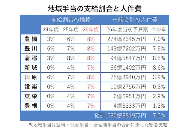 蒲郡を除く東三河の7市町村は、職員の給料に上乗せする「地域手当」の支給割合を、今年度に続き新年度も引き上げる。豊橋、豊川、田原は8%とし、先行する蒲郡と並ぶ。現行水準が4%にとどまる新城、設楽、東栄、豊根は7%まで拡充。職員確保が自治体運営の課題となる中、採用の円滑化や離職抑制につながるか注目される。