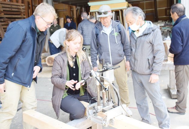 指導を受けながらほぞ加工をするスピースさん(新城市八束穂の戸田工務店作業場で)