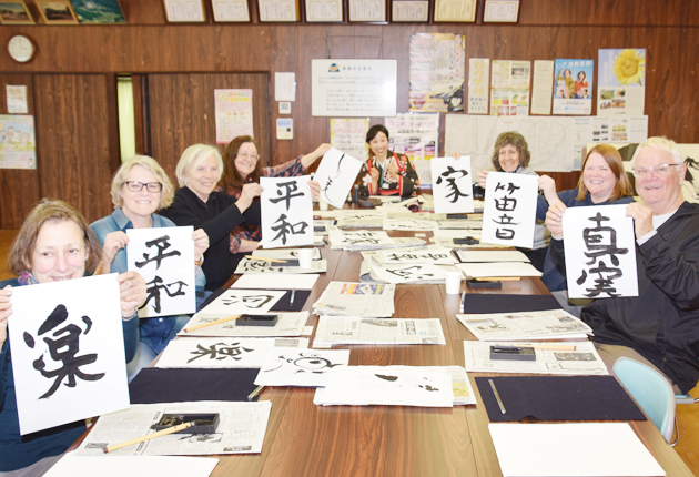 自分の書を掲げる参加者ら(同市八束穂公民館で)