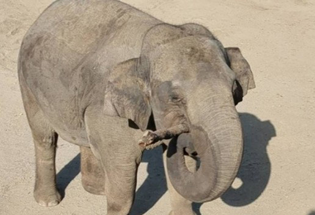 剪定枝を食べるのんほいパークのアジアゾウ(豊橋市提供)