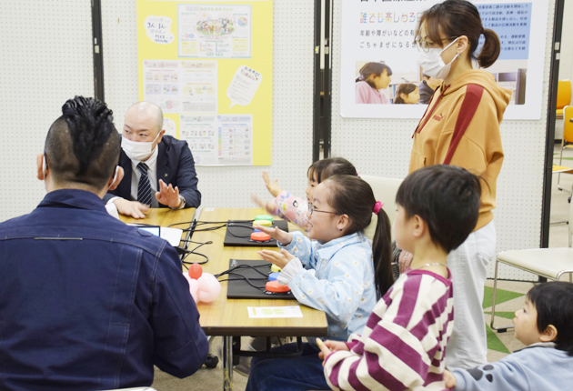 会館の15カ所で、車いす、手話、点訳などの福祉体験、ボッチャ、モルック、eスポーツ体験、認知症VR体験、健康体操のほか、福祉用具展示、夕食宅配・介護食紹介などを行った。また、新城有教館高校の演劇部の活動発表、黄柳野高校介拓生プログラム体験発表、「元気夢太鼓」の演奏などもあった。福祉事業所即売(6事業所)、キッチンカー販売(5台)などのコーナーも設けられた。訪れた市民らが館内を巡りながら楽しんだ。