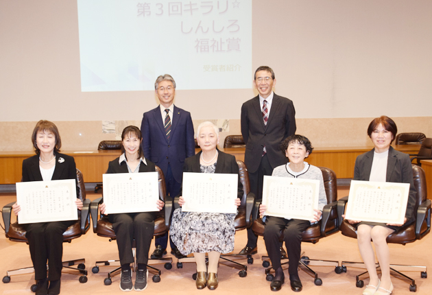 大会議室では、市内福祉施設で活躍する人を応援する「キラリしんしろ福祉賞」の表彰も行われた。市福祉事業者支援施策推進会議(長坂宏座長)が主催。グループホームとみさかの小野田律子さん、特別養護老人ホームくるみ荘の原江利子さん、西部福祉会館の塚本春美さん、八楽児童寮の森田恵理さん、「レインボーのお菓子やさん」の千賀佳代子さん、新城こども園の板澤崇文さん、やすらぎの家の池田知子さんの7人(欠席2人)が、下江洋行市長から賞状を受け取った。