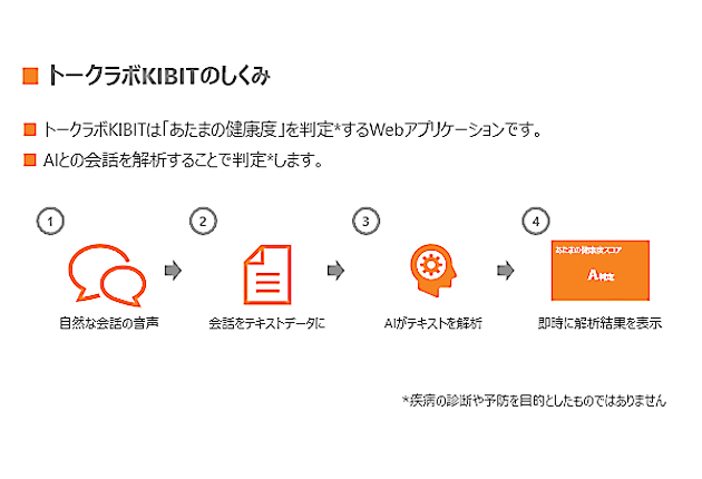 トークラボKIBITは、FRONTEOが自社開発したAI「KIBIT」の自然言語処理技術を使って、自然会話の中の単語や文章の関係性や特徴を解析し、判定結果を提示する。加えて判定結果に基づき、ユーザーに行動変容を促すメッセージや生活習慣の改善につながる情報を提供する。