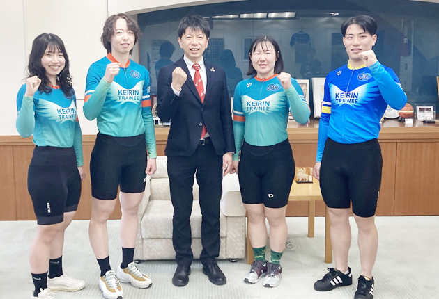 今月、日本競輪選手養成所を卒業し、プロ入りした豊橋市にゆかりのある新人4選手が25日、同市役所に長坂尚登市長を表敬訪問した。厳しいトレーニングや選考を乗り超えて晴れ舞台の切符を手にした。市長からは「豊橋の代表として活躍してほしい」と激励を受けた。