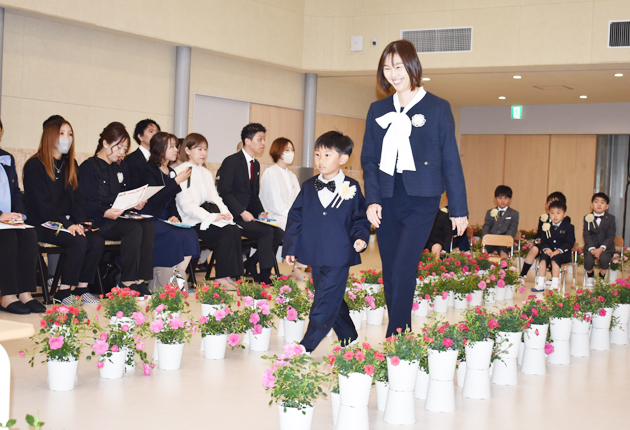 会場には、同市平井町の清花園によって鉢植えされたミニバラ380個が並んだ。同社が特許を持つ「スイートハートメモリー」と「キャンディキャンディ」のほか、「スイートルビー」「リトルマリー」の全4品種が並び、赤やピンクのバラに囲まれる中、子どもたちは保護者と並んで黒野昌寛理事長から卒園証書を受け取り、元気に惜別の歌を口ずさんだ。涙を流す父母らの胸にも特別な思い出を刻んだ。