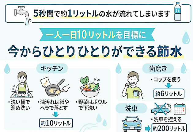 公式ホームページに調理や歯磨き、洗濯などで「ひとりひとりができる節水対策の目安」を掲載し、市民に1人あたり1日10㍑を目標に協力を呼びかける。27日からは配水本管のバルブを操作し配水量の制限をさらに強化するため、蛇口から水が出にくくなることがあるとして理解を求める。