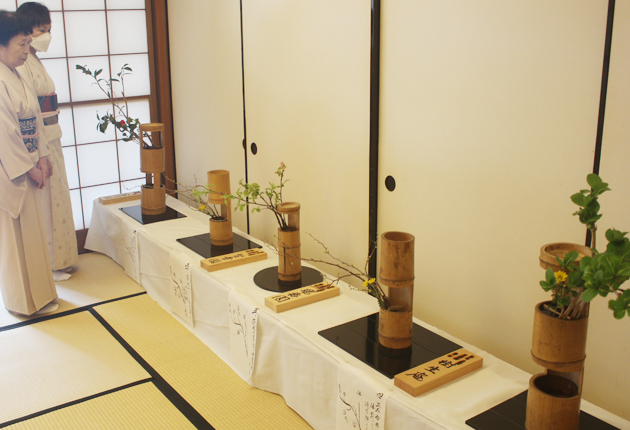 また今年のテーマとした「竹」の器を使った「五行(ごぎょう)生け」の作品も並ぶ。支部員は、会館の雰囲気に沿った花材や春を感じさせる雰囲気の生け花を出展。年に1度の展示会に向けて磨き上げてきた感性を伝えている。