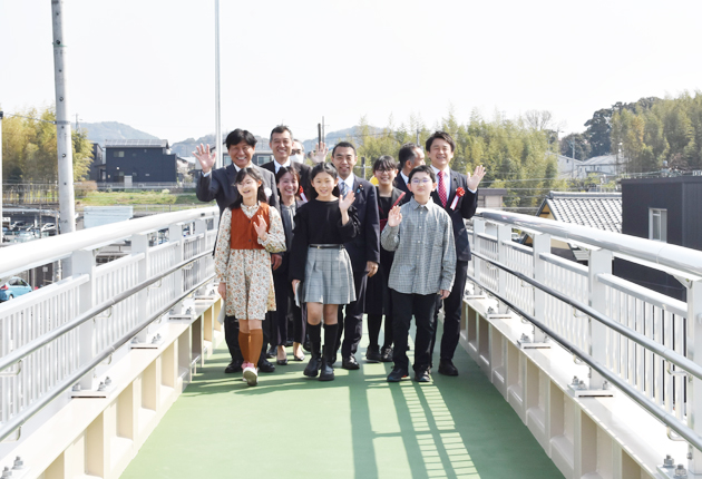 豊川市の名鉄国府駅前の国道1号交差点に新設された「国府駅前横断歩道橋」で28日、完成祝い式が地元町内会など主催で開かれた。当初の計画より5カ月前倒しで完成し、この新年度から通学路として利用する小中学生らが渡り初めに臨んだ。県内では類のない危険な通学環境に安全なルートが生まれた。
