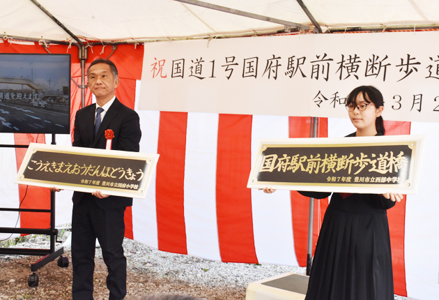 歩道橋は延長31メートル、高さ6メートルで通路の幅員は2メートル。横断歩道は撤去され、代わりに自転車横断帯が整備された。橋の入り口に設置された橋名板の字は、漢字を西部中の木髙奏子さんが、平仮名を国府小の関航毅君が書き、式典でお披露目された。