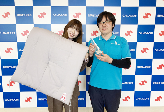 循環型お昼寝ふとん「めぐりね」と畑川社長㊨(蒲郡市・蒲郡商工会議所で)