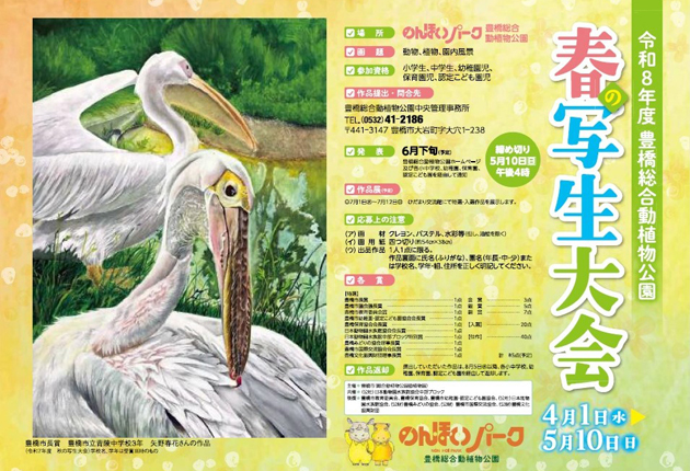 豊橋総合動植物公園(のんほいパーク)は1日から「春の写生大会」を開催する。 参加対象は幼稚園、保育園、認定こども園の園児と小中学生。園内の動物、植物、風景をテーマにした作品を募集する。画材はクレヨン、パステル、水彩などに限られ(油絵は不可...