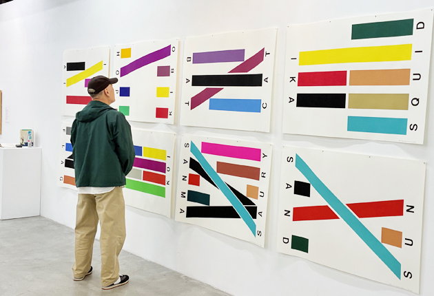 彫刻家で画家、詩人でもある飯田善國さんの作品は、言葉を色で表現した抽象画で、言葉と色の組み合わせが面白い。