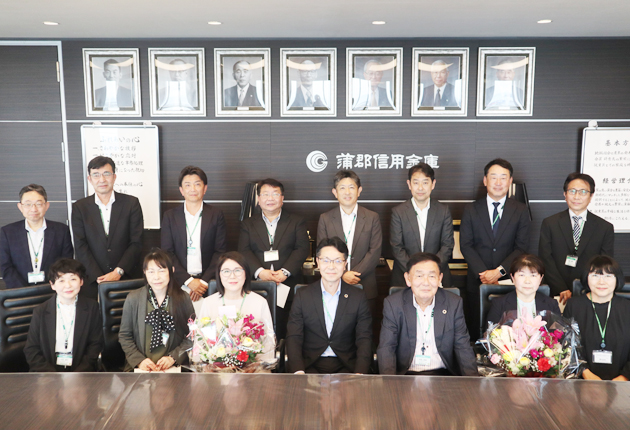 定年退職者の皆さん(蒲郡市の蒲郡信金本店で)