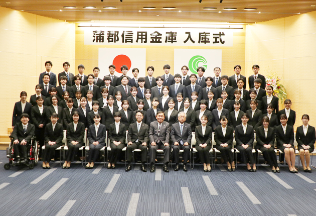 入庫式に出席した新入職員ら=蒲郡市の蒲郡信金本店で(提供)