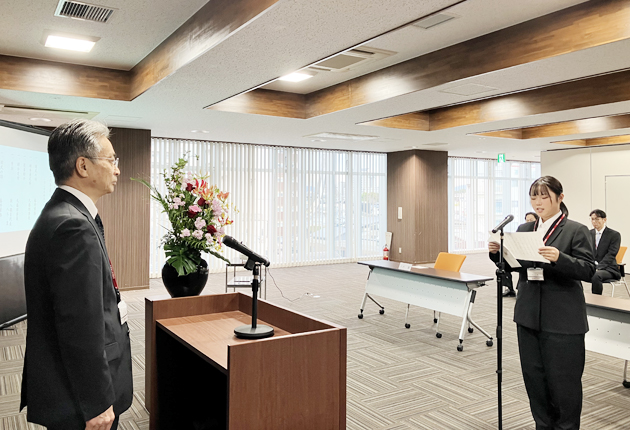 誓いの言葉を述べる新入職員=豊橋商工信用組合で(提供)