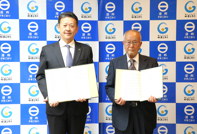 鈴木市長㊧と協定書を交わした都社長=蒲郡市役所で(提供)