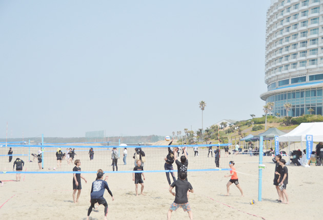 大会は穏やかな陽気となった3月29日、男女別の2人制、4人制で行われ、地元や高校、名古屋、浜松などの28チームが参加、白熱した試合を繰り広げた。砂浜にコート5面が設けられ、参加者は裸足で砂の感覚を楽しみながら、力強いスパイク、レシーブを披露した。