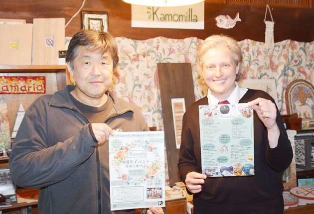 チラシを手に来場を呼びかける橋本夫妻(設楽町清崎の「カモミッラ」で)